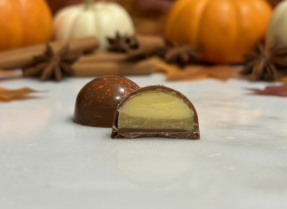 Pumpkin Caramel Ganache (Pumpkin, Butter, Sugar, Glucose Syrup, White Chocolate 36% (Columbia), Cocoa Butter, Citric Acid